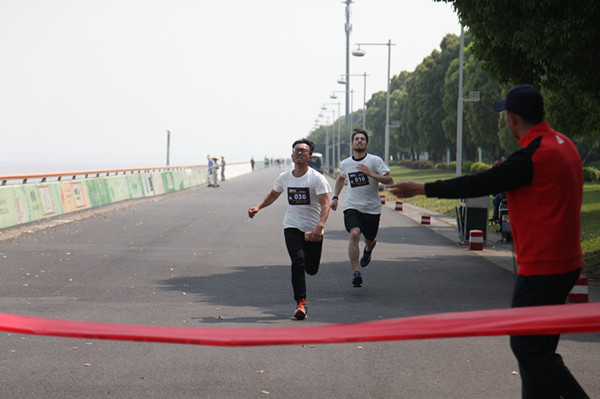 本次比赛是从钱塘江边江堤上起跑,沿着钱塘江美丽的河岸一路向东,到达中心点路口折返,全程共计3公里。随着郜校长“砰”的一声发令枪声响起,百名身着白色T恤的运动员们如离玄之箭冲向前方,运动员们拼尽全力,拉拉队员们也不停地为运动员加油助威。比赛进行9分钟左右,两名选手向终点奔过来,在冲向终点的瞬间,来自大陆的材纺学院学生余龙飞从第二名反超法国学生jafar,一举夺冠,获得男生组第一名。随后,来自台湾的经管学院的黄淑婷以绝对的优势战胜了其他选手,获得了女生组第一名。运动员们赛场上挥汗如雨,充分体现了努力拼搏,永不服输的体育精神,在终点等候的老师和志愿者们也深受感染,整个赛场充满了激烈又热闹的气氛。