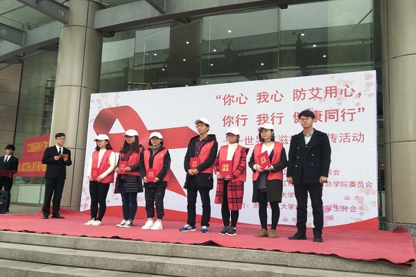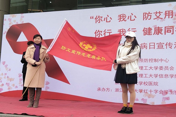 梁若枫为防艾志愿小分队授旗,志愿者们将走出校门,走进社区持续开展更多丰富多彩且富有实效的防艾教育活动。叶勇巨为“以爱为名,为艾传书”书信大赛中的优秀作品获奖者进行颁奖。活动还对在浙江省血液中心组织的在杭高校感恩服务月表彰大会中获得 “杰出志愿者”与“优秀志愿者”的称号的志愿者进行表彰
