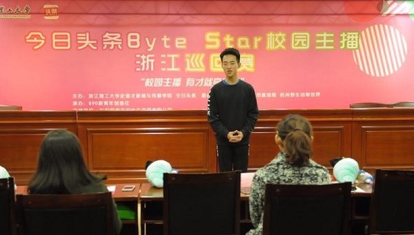 11月18日和22日,由史量才新闻与传播学院联合今日头条浙江分公司、衢州市旅游委员会、东阳市旅游局、杭州野生动物世界举办的“今日头条 Byte Star 校园主播浙江巡回赛”首赛在我校举行,史量才新闻与传播学院党总支副书记方平,今日头条浙江分公司公共事务部总监何颖、浙江传媒学院形象设计专家卜晓风担任首赛评委。70多位选手报名参加首赛。