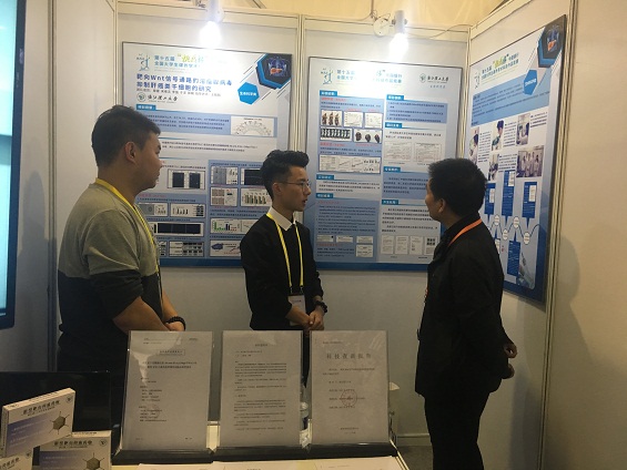 备赛期间,校团委、学院高度重视,学校团委多次组织模拟答辩,学院多次组织专业老师对项目进行指导,并组织专家进行答辩演练,指导教师和参赛学生积极备战。决赛期间,校党委副书记周文龙教授莅临比赛现场给予指导和鼓励,团省委副书记周苏红莅临现场,听取团队汇报,并给予了充分的肯定,她指出项目取得了突破性进展,将来如果进入临床治疗,将是对全人类做出的重要贡献。在封闭评审的两天时间内,项目得到了20多位专家的评审,专家组成员均对本项目构建的双靶向溶瘤腺病毒以及对肿瘤的杀伤效果给予高度评价,并寄予厚望。经过作品现场展示、团队汇报、评委现场问辩等环节的激烈角逐,最终斩获国赛一等奖。